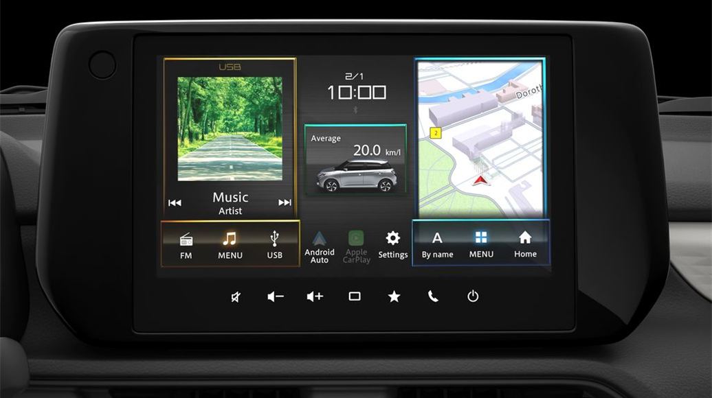 L’infotainment con schermo touch da 9” è stato aggiornato nella parte hardware e software. Il nuovo display ad effetto sospeso è leggermente inclinato verso il guidatore per facilitarne la lettura e il raggiungimento dei comandi. La nuova interfaccia reattiva e moderna può essere personalizzata. Il sistema è ricco di funzioni come il collegamento ai sistemi di bordo e la connettività smartphone è compatibile Apple CarPlay® Wireless ed Android Auto.