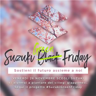 Suzuki Italia utilizzerà lo 0,5% del fatturato giornaliero ottenuto durante il "Black Friday" di venerdì 26 Novembre per donare dei ciliegi giapponesi al Comune di Torino, la splendida città che ne ospita la sede e che è gemellata con la città giapponese di Nagoya.